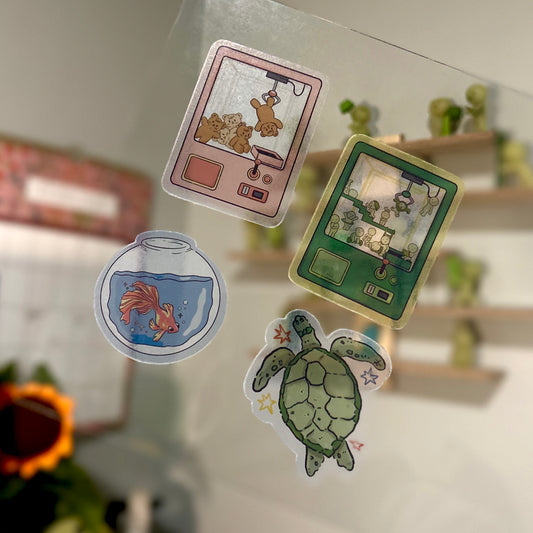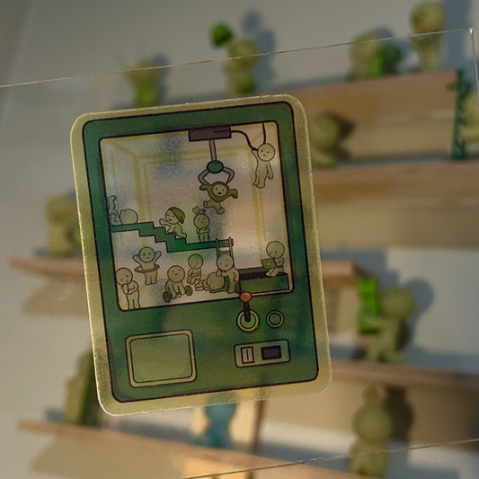 Green Little Guys Trapped in a Claw Machine Translucent Vinyl Sticker